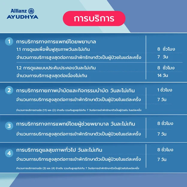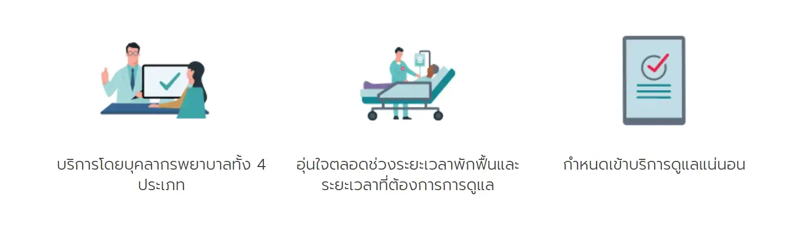 - กำหนดเข้าบริการดูแลแน่นอน ตามวัน และเวลาที่นัดหมายล่วงหน้า โดยท่านจะได้รับการดูแลอย่างต่อเนื่องหลังออกจากโรงพยาบาล สำหรับบริการดูแลคุณยามพักฟื้น ดูแลคุณสูงสุด 7 วัน ต่อการเข้าพักรักษาตัวเป็นผู้ป่วยในในแต่ละครั้ง และสำหรับการดูแลแบบประคับประคอง ดูแลคุณสูงสุด 14 วัน (1 ครั้งตลอดระยะเวลาที่คุ้มครอง) โดยให้บริการตั้งแต่เวลา 8.00 – 18.00 น.