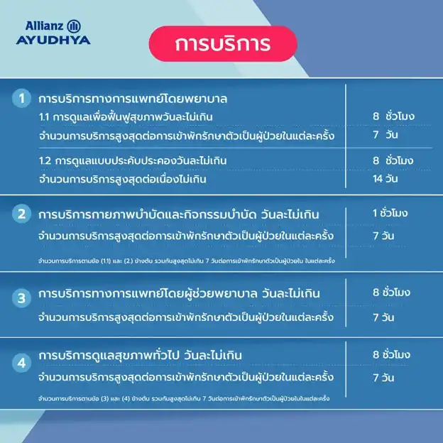 อลิอันซ์ อยุธยา ยังอยากให้คุณได้รับการดูแลจากมืออาชีพอย่างต่อเนื่องเหมือนอยู่ที่โรงพยาบาล หมดกังวลเรื่องการดูแลตัวเอง เพื่อให้การพักฟื้นเป็นการ “พัก” เพื่อ “ฟื้น” อย่างแท้จริง รวมไปถึงการดูแลแบบประคับประคอง (Palliative Care)* โดยไม่มีค่าใช้จ่าย ด้วยบริการดูแลคุณยามพักฟื้น (Nursing Care Service)