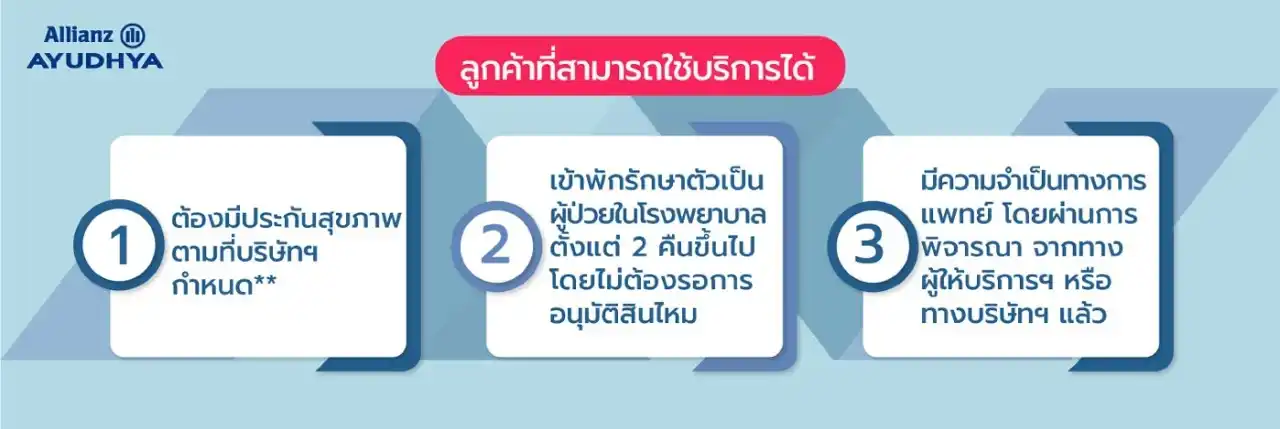 บริการนี้เป็นบริการเสริมพิเศษ เฉพาะลูกค้าที่มีแบบประกันตามที่กำหนดกับอลิอันซ์ อยุธยา และเข้าพักรักษาตัวในฐานะผู้ป่วยใน ตั้งแต่ 2 คืนขึ้นไป หรือ ในกรณีเข้ารับการผ่าตัด หรือเข้าพักรักษาตัวในห้อง I.C.U., หรือเป็นผู้ป่วยที่เข้ารับการรักษาใน รพ. ด้วยโรคหัวใจ, โรคเส้นเลือดสมองแตกหรืออุดตัน, โรคเกี่ยวกับกระดูกสันหลัง, โรคเกี่ยวกับกระดูก, โรคเกี่ยวกับกระดูกแตกหัก, โรคมะเร็ง โดยไม่ต้องรอการอนุมัติสินไหมทดแทนจากอลิอันซ์ อยุธยา ค่ะ/ครับ
