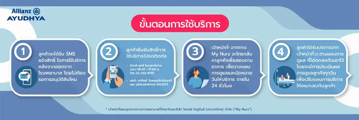 อย่างไรก็ตาม ผู้เอาประกันภัยจะต้องตอบรับการใช้บริการภายใน 30 วัน นับจากวันที่ออกจากโรงพยาบาล และใช้บริการภายใน 7 วัน นับจากวันที่ผู้เอาประกันภัยตอบรับแผนการดูแลคุณยามพักฟื้นกับบริษัท โครนัส โซลูชั่นส์ (ประเทศไทย) จำกัด (“My Nurz”)